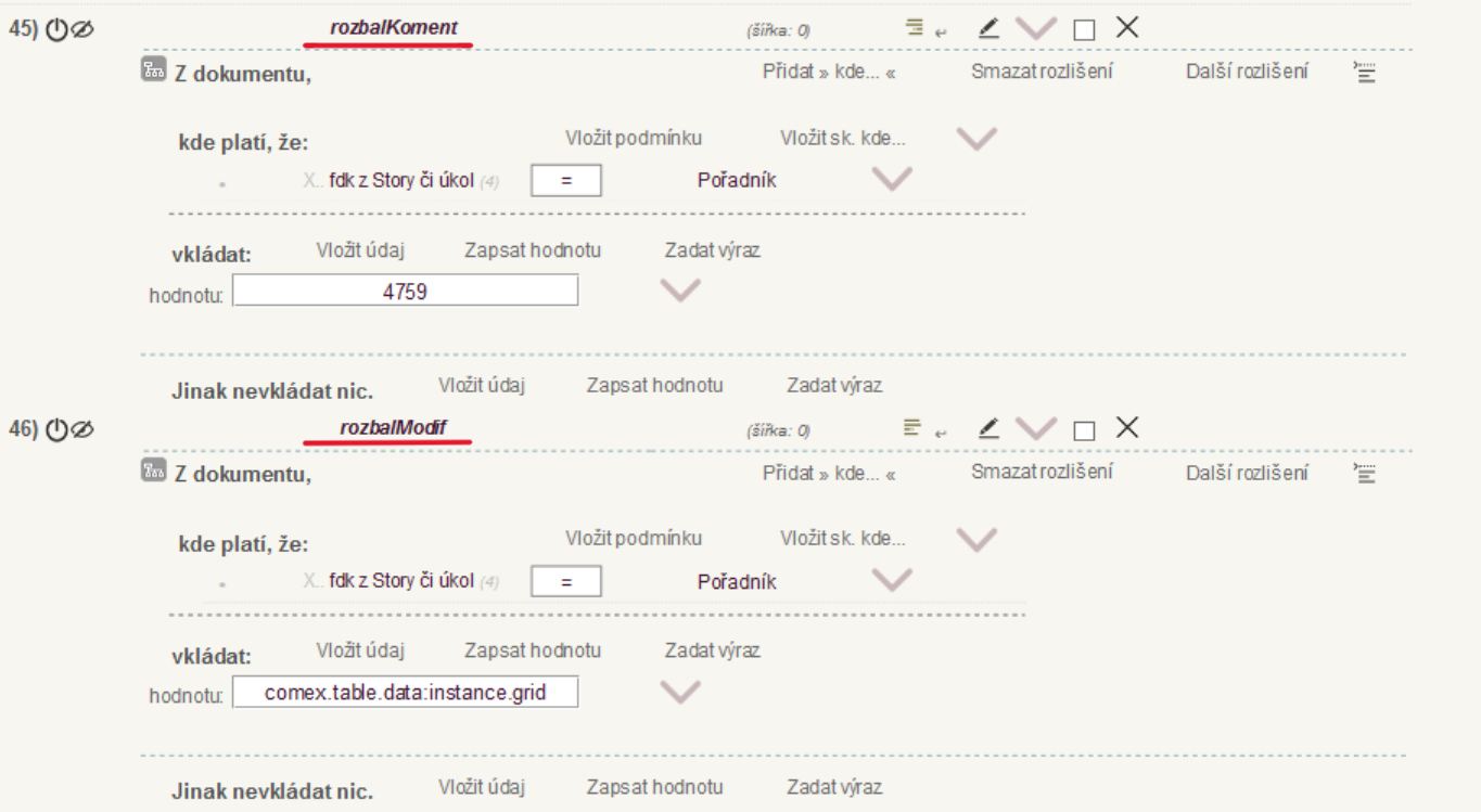 - Vložte parametr Rozbalovací řádek – součást (sloupec) a jako hodnotu uveďte rozbalKoment (E10000000d).