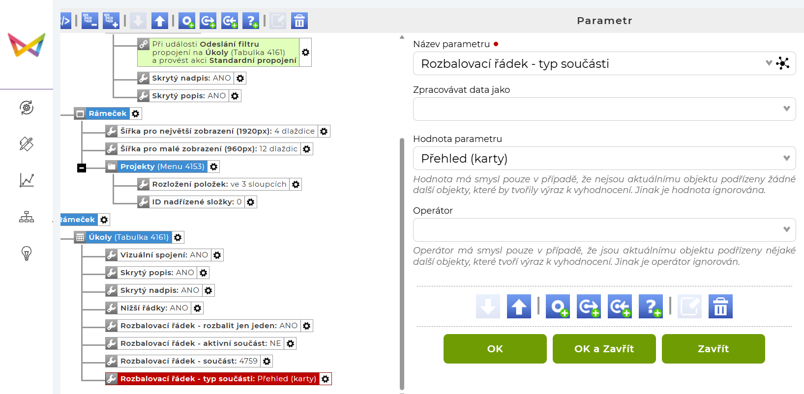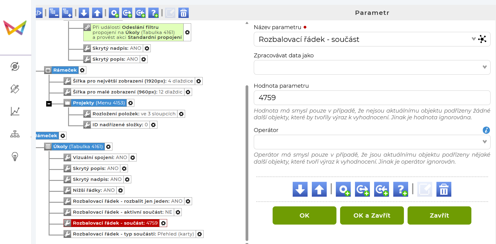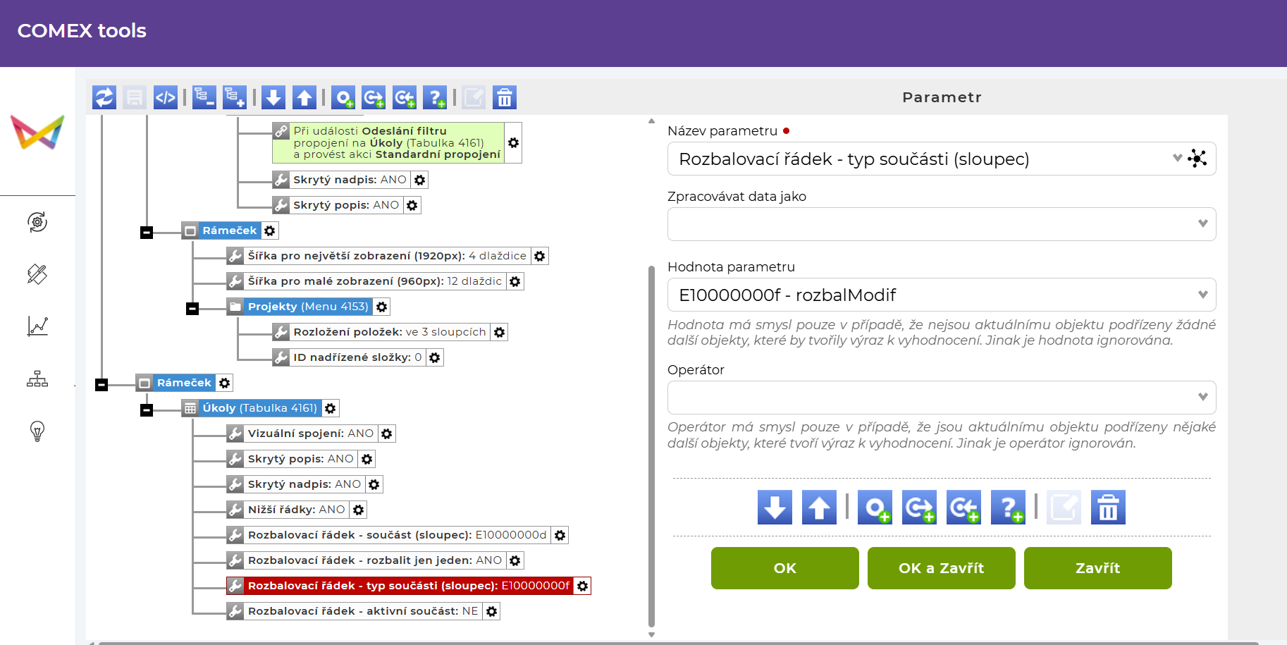 - Vložte další parametr Rozbalovací řádek – typ součásti (sloupec) a jako hodnotu uveďte rozbalModif (E10000000f).