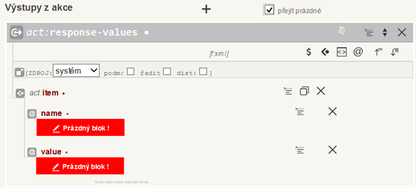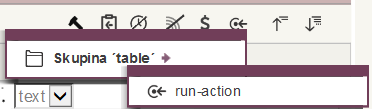 Např.pro volání jiné akce zvolíme pomocí ikony šipky volanou akci (ikonou kladívka můžeme otevřít nastavení této akce) a její název včetně ID se zapíše do hlavičky volané služby