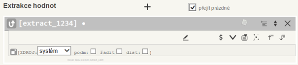 Extrakce hodnoty umožňuje připravit (extrahovat) hodnotu, která je dostupná v dalších částech a fázích, je použitelná i jako vstup pro přehled. Jejínastavení funguje podobným způsobem jako zapamatovaná hodnota (viz kapitola Používané ikony).