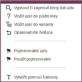 Pro celý uzel je možné vložit podmínku, vložit jej do bloku varianta nebo opakovat podle řetězce. Uzel je také možnépojmenovat a případně dříve vložené pojmenování použít. Je také možné tvořit daný uzel pomocí šablony, kterou vybereme z nabídky.
