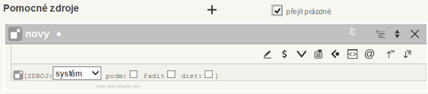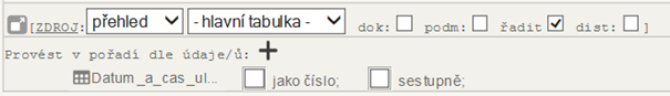 Opět zde vidíme zdroj, ze kterého budou čerpána data do daného dokumentu. Zde je automaticky nastaven přehled (hlavní tabulka). Existuje více možností zdrojů (viz kapitolaPoužívané ikony)