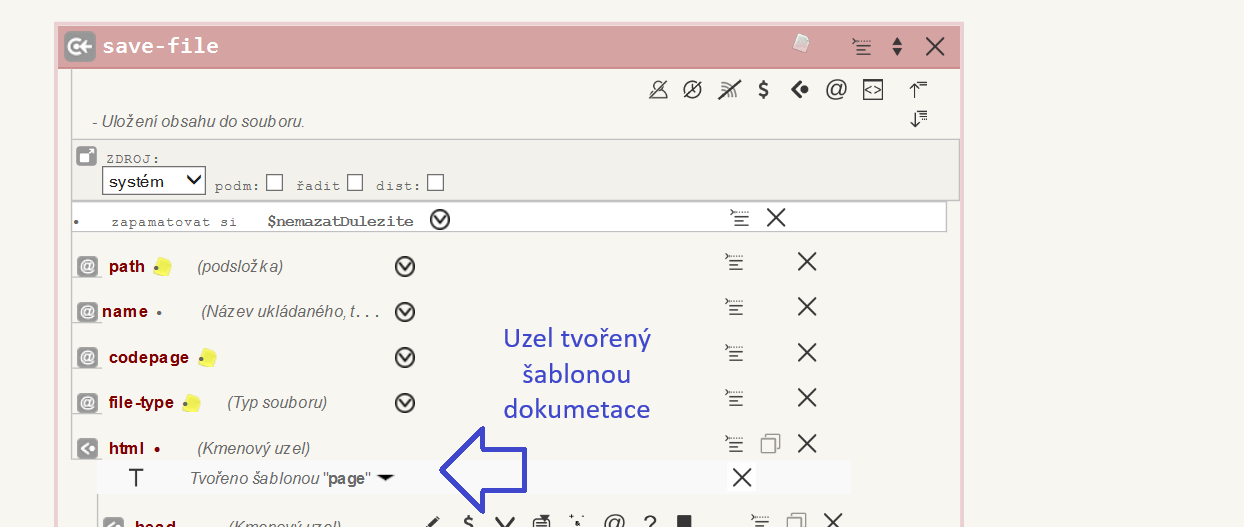 V tomto uzlu html je pomocí volby "Vytvořit pomocí šablony" vybrána šablona umístěná na webovém sídle v souboru:
