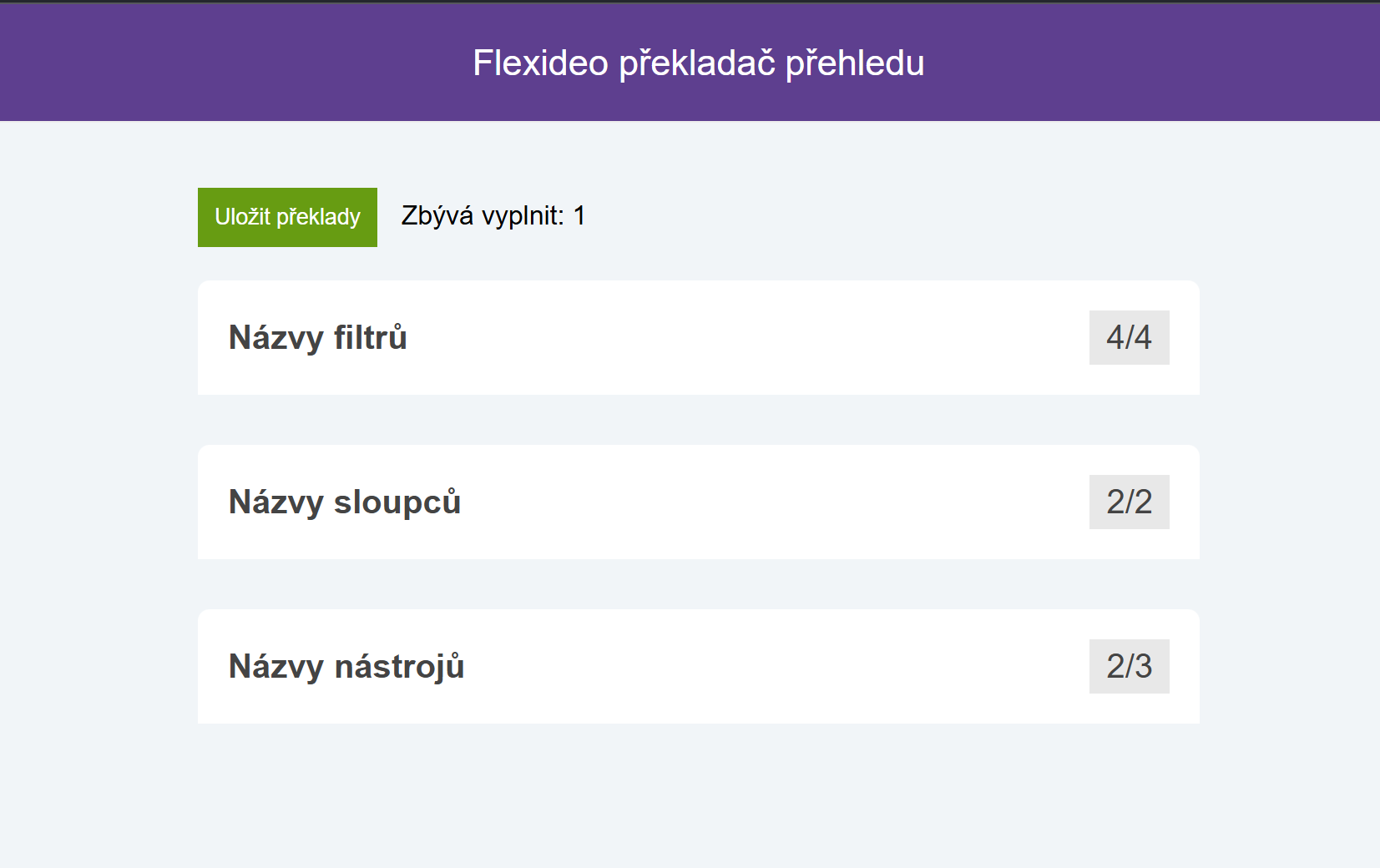 Překladač si kontroluje počet vyplněných polí a dynamicky upozorňuje uživatele na počet polí, která je ještě potřeba vyplnit. Kontroluje také použití speciálních znaků, které jsou zakázané. Po uložení se odesílá požadavek save-settings pro daný přehled, uživatele a jazyk na tabulku user-translate-${kód jazyka}.