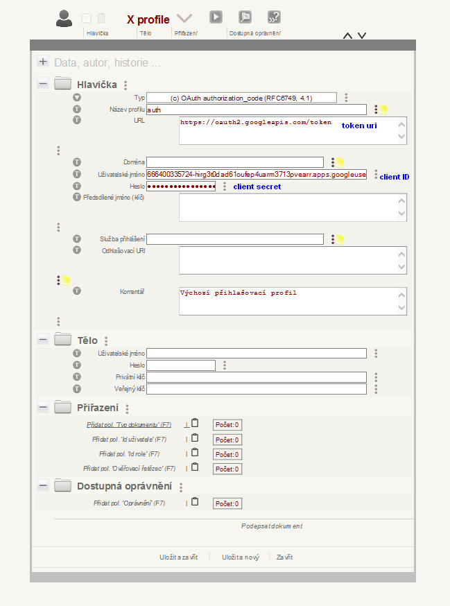 vytvořit auth profile (dokument x_profile) ve Flexideo aplikaci, default Název profilu : auth