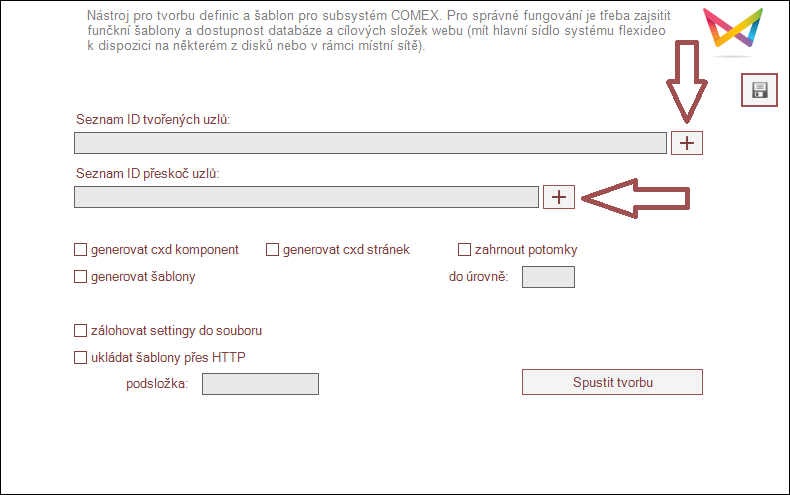 Seznam ID tvořených uzlů - čárkami oddělený seznam id uzlů, které mají být aktualizovány v COMEX struktuře definic případně šablon. Jiným slovy každá tabulka vytvořená v intranetu má své id. A pokud je třeba aktualizovat je nutné zadat její id.