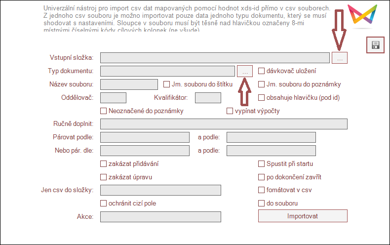 Jedná se o univerzální nástroj pro import csv dat mapovaných pomocí hodnot xds-id přímo v csv souborech. Z jednoho csv souboru je možno importovat pouze data jednoho typu dokumentu, který se musí shodovat s nastaveními.