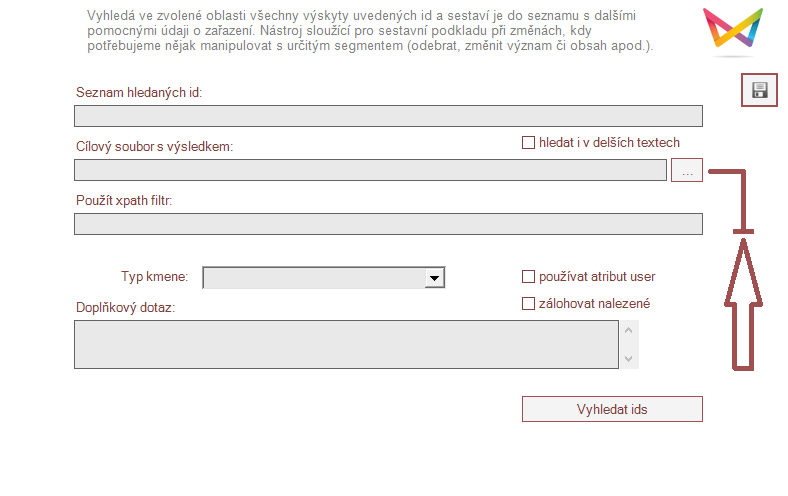 Cílový soubor s výsledkem - složka a soubor pro umístění přehledu nalezených. Zadejte požadované umístění cílového souboru s xml seznamem hledanýchidentifikátorů.