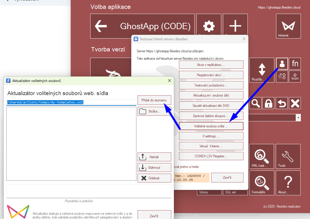 Jakmile jej umístíte do site-fieles, je možné provést upload na přihlášenou instanci tlačítkem Nahrát.