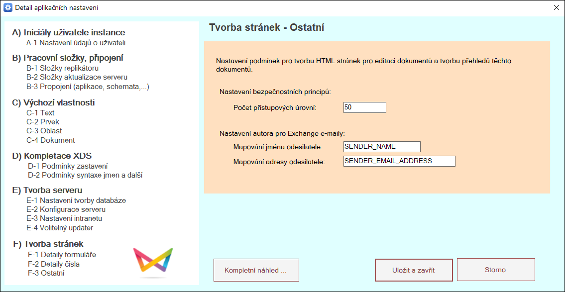 - nastavení bezpečnostních principů - nastavení určuje maximální možný počet přístupových urovní použitých v aplikaci;