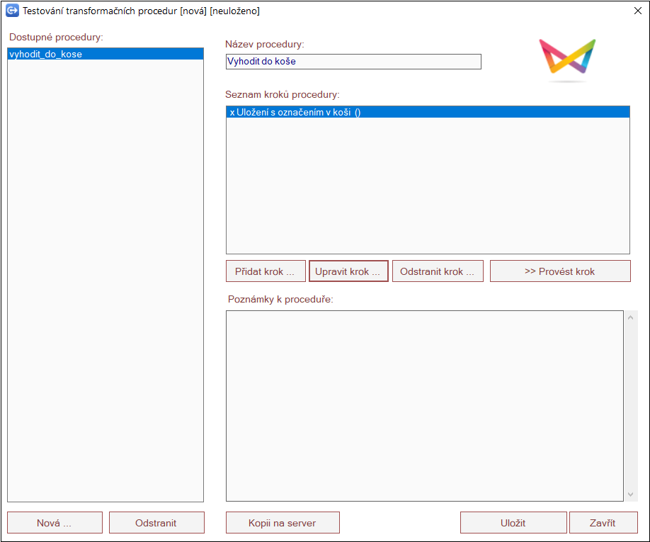 Mezi seznamem kroků a těmito poznámkami jsou tlačítka pro manipulaci se seznamem kroků. Seznam neumožňuje měnit pořadí kroků, protože kroky většinou na sebe navazují a jejich nechtěné přehození by mohlo způsobit vážné potíže. Nicméně je možné předřadit nový krok na již exitující pozici, pokud tuto pozici v seznamu vyberete a pak dáte přidat. Budete dotázání, zda je požadováno předřazení nebo vložení na konec seznamu. Vedle tlačítek pro úpravu kroků je na pravé straně volba "» provést krok", která umožňuje jejich testování v praxi s tím, že vstupy, výstupy a použité dotazy se ukládají do samostatných souborů do podsložky developers umístěné ve složce transformace.