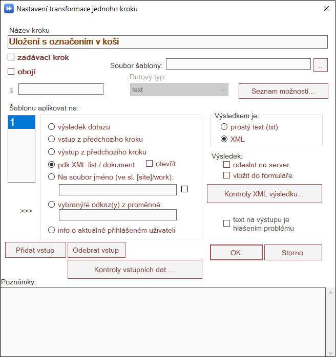 Pokud jde o transformační krok, pak je třeba nastavit vstupní XMLtransformace, tedy to na co bude dodaná šablona aplikována - viz. volba nalevo ve střední části okna. Vstupů může být několik s tím, že XML je reprezentováno vždy kmenovým tagem input a jeho potomci korespondují s položkami navolenými v této části - tj. každý přidaný vstuprovná se jednomu kmenovému potomku vstupního XML. Vstupy se přidávají a odebírají tlačítky "Přidat vstup" a "Odebrat vstup" pod seznamem vstupních uzlů. Vstupní XML je možné kombinovat z následujících vstupních možností: