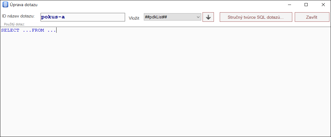 Pokudjako vstup zvolíte načtení dat pomocí dotazu, máte možnost zobrazit následující dialog pro zadání vstupního SQL dotazu: