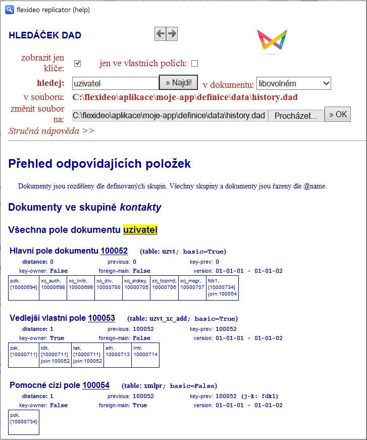 Obsah prohlížeče je rozdělen do dvou částí. Nad čarou je formulář pro zadání vyhledávání s možností přechodu tam a zpět po zadaných vyhledáváních a také je zdevolba souboru DAD, který má být prohledáván. Pod čarou je pak výsledek zadaného vyhledávání. Vyhledávání je striktní, nikoli slovníkové a daleko častěji je využito k vyhledání čísel než-li názvů. Na podtržené údaje a i na údaje v rámečcích je možné kliknout a snadno tak zadat "rozkliknutou" hodnotudo hlavní kolonky vyhledávače. Vyhledávání je možné buď v rámci celého souboru (tj. aplikace nebo role) nebo v rámci jednoho zvoleného typu dokumentu, jejichž seznam je v roletce vedle vyhledávací kolonky (v příkladu je zvolen typ action_register). Pro přehlednějšízobrazení je možné zobrazit jen klíčové hodnoty, pokud vás zajímají jen ty (tak jako v příkladu) nebo je možné zobrazit všechny hodnoty daného pole. Výčet odpovídajícíh polí je možné omezit jen na vlastní pole (tj. na ty s vlastností @basic='True'). U každého políčkazobrazeného ve výsledku funguje bublinová nápověda, která zobrazuje všechny vlastnosti (atributy) daného políčka. Výsledek je dělen do dokumentů a jeho polí s tím, že každé pole (tag array z DAD) má zobrazeno své vlastnosti a seznam buď všech nebo jen klíčových políček. Tj.jde o vyhledávač polí a další filtrace v rámci jednoho pole již není - vždy se zobrazí celé pole, pokud obsahuje hledanou hodnotu.