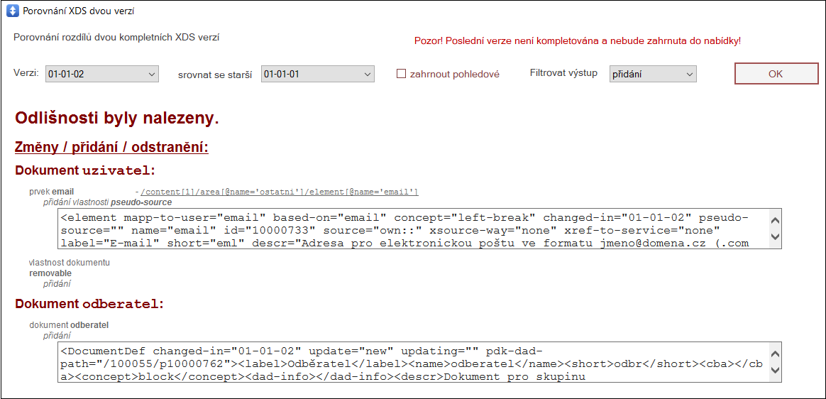 Na rozdíl od předchozího, má tento prohlížeč své dobré využití. Srovnává totiž soubory complete.xds dvou zvolených verzí avypíše v čem se obě definice liší.