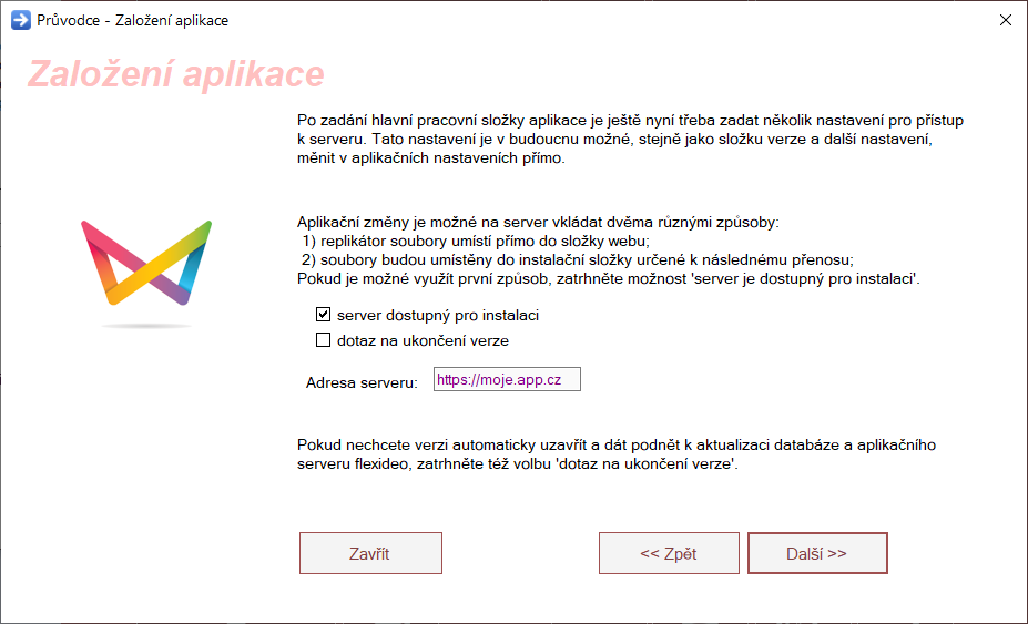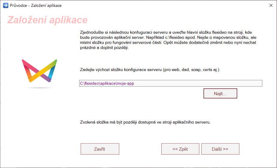 Pro zjednodušení a následnou konfiguraci serveru uveďte hlavní složku flexideo na stroji, kde bude provozovánaplikační server. Např: c:\flexideo\.... Nejde o mapovou složku, ale o místní složku pro fungování serverové části.
