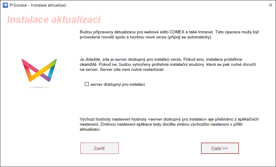 Zde je možnost volby „zaškrtávátkem“ zda je server dostupný pro instalaci nebo není. Zaškrtnete-li tuto volbu tak instalace proběhne okamžitě. Pokud tuto volbunezvolíte tak budou vytvořený potřebné soubory k instalaci, které je potřeba později doručit na server kde běží Vaše aplikace.