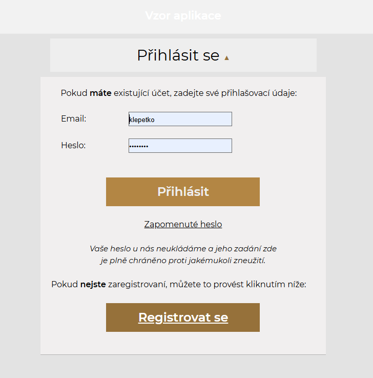 Provedení formuláže je libovolné, ale pro přihlášení je třeba odeslat požadavek tohoto typu: