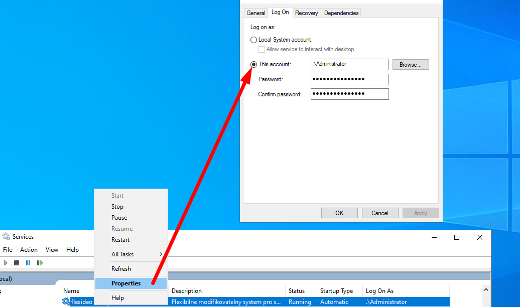 Po úspěšné zaregistrování služby na serveru, viz. předchozí článek, se silně doporučuje na nově registrované Windows službě flexideo nastavit administrátorský účet serveru tak, aby služba měla dostatečná oprávnění pro file-systém a databázi: