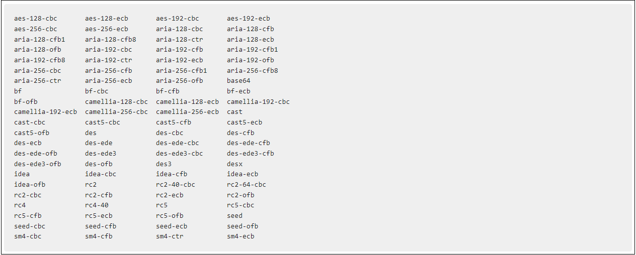 Požadavek podporuje kompletní seznam hash funkcí podporovaných knihovnou OpenSLL. Pro bližší informace spusťte openssl help. Níže jsou uvedeny hash funkce podporované v době vzniku dokementace, pro aktuální informace navštivte dokumentaci OpenSSL.